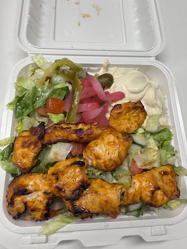 We went with two platters: the shish taouk and the mixed BBQ. Each comes with salad and your choice of rice or fries. I was in the mood for something lighter, so I asked for just salad (no rice or fries) and for the sauces/dressing on the side. Instead, I received a generous helping of hummus—which I can’t and won’t complain about! My husband got the mixed BBQ with rice.