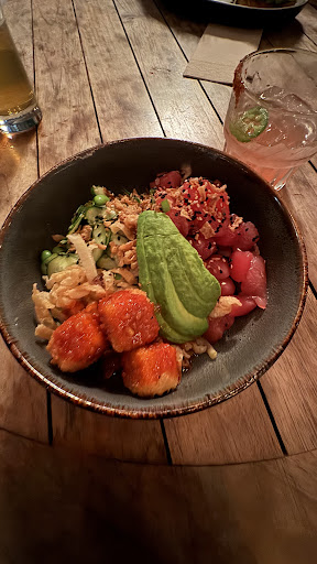 Nice music with very balanced volume for both conversation and entertainment, great architecture and lighting with high ceilings and multiple seating options, creative & diverse menu, and big plates!, vibrant crowd, friendly and attentive personnel.