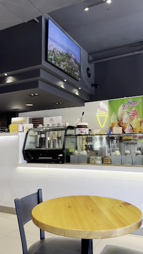 DECOR- Place is full of super giant screen TV all over the place and Huge art paintings of sweets of honey balls etc. hung on their walls. Money has been over spent to update to a modern setting however its overkill. Expresso cups with saucers to match with company logo/brand printed on it for sale, different size boxes for take out in different size with company logo/brand to showcase and hats and shirts for purchase.