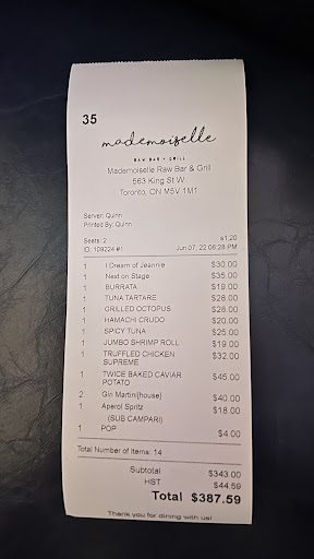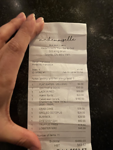 Edit: In the owner's response, they had to make mention of the exclusive alcohol used in their restaurant (B10 Belvedere) which, I have to add, has a far less rigorous filtration process than its competition, Grey Goose. I get it - they have patrons who are willing to spend a lot of money. Cool. What does that have to do with the fact that their kitchen put shrimp in TWO dishes we ordered after telling your servers we have a shrimp allergy? And then, your manager had the audacity to tell us we need to leave to make space for another reservation when we were already waiting for our bill... It would appear the owner is missing more than one point here. They say, 'Money can't buy you class' and that point is made astonishingly clear at Mademoiselle, another mismanaged establishment in Toronto where you clearly can't pay to get good...