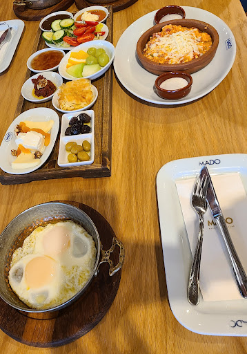 Read moreFinally, I got the opportunity to visit MADO for breakfast. Many of my friends hyped this restaurant up, so I was super excited to visit. As soon as I stepped foot through the front door, I understood why it was hyped to that level. The ambiance immediately stimulated all my senses. I felt like a child in theme park. The colours, lighting, music smell, layout all made me feel happy and welcome. If you are looking for an authentic Turkish feel, this isn't the place for you, as you will experience an infusion of Turkish and international cultures. The place was very clean, and the display of bakeries, Turkish delights and Turkish ice cream was attractive and very inviting. However, the flavours of the dishes we tried did not live up to expectations. We tried: The menamen 3/5 - the tomato flavour was overwhelming The kaymak - the texture and the taste was of that served from a can 2/5 The kashar cheese gözleme 3/5 - cheese did not have any flavour, but the dough was spot on. The biggest disappointment was that the bread was cold.. considering that this restaurant is also a bakery, this should have been spot on.