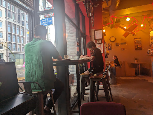 Tasty drinks and pastries, interesting and beautiful art that rotates throughout the months. The staff are mostly neutral, somewhat inviting but also can mess up your order easily as the volume of the store is constantly too loud for anyone to communicate properly. Calen always brings the best vibes in their service while others are so-so depending on how busy it is, the customer care + attention can be lost. I definitely have left satisfied with drinks and pastries before although some were served better than others, sometimes the matcha is clumpy or not as tasty as it could be. The volume of the music in this cafe no matter if it is 6am or 7pm is consistently at such a high volume that it makes this place completely intolerable to sit down in which is why i rated lower stars. The space is beautiful with interesting artwork to look at and church pews to sit on, but I have never and will never sit down in this space as the volume is ridiculous and affects how you can communicate with the staff as well as peers. It is overstimulating for most and creates a huge divide from those with accessibility needs. Although the space is very queer friendly presenting, you will also get stared at by old men as you walk in, everytime without fail. Not really in their control but also adds to the point of never wanting to sit in this cafe. If the volume is lowered and the space is treated more as a social space like I imagine its intended to be with alcoholic options, perhaps more folks...