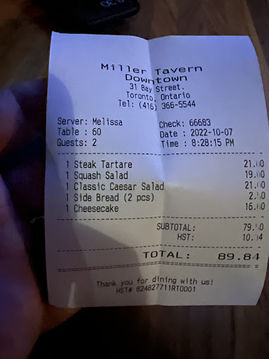 Read moreLast night may have been one of the worst restaurant experience I have ever had in Toronto. This is the first time I am writing a negative review for Miller Tavern and will certainly be the last time I go back or recommend it to my colleagues or friends again. The night started off with an extremely rude bartender, I believe his name is Matt, who refused to serve us (a large group of 13 people) while we waited for our table to get ready. I understand that it can be a bit challenging to transfer bills over to another server, but most restaurants do this happily, or at the worst just ask you to pay upfront. Another colleague asked to see a list of their available ryes for a whiskey on the rocks and was told to “just look at the shelf” even though there were several dozens options to chose from. It was an uncomfortable and unpleasant way to begin the night. When the table became ready for us, we were seated and served by a fellow named Angelo. Angelo was even worse than the bartender. His demeanor the entire time made us feel like we were a burden to him and it seemed like he made every effort to make our experience as bad as it possibly could be. He was rude, dismissive, and preferred just telling us that they were out of every wine instead of kindly telling us what was actually available. I found it really convenient that the only bottles in stock were $80 or $155 and I suspect he just wanted to get the most out of us for his personal gain. The worst part was how he handled the payment, making it VERY clear that gratuity was not included while he watched like a hawk as we paid for the bill. This man was probably the worst server I have ever had and, frankly, I was embarrassed to have suggested this restaurant to our out of town colleagues. I can assure you that it will never happen again. It is unfortunate that this restaurant has gone down hill this much. I hope that management is able to rectify their issues and turn...