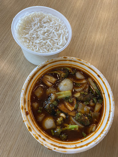 I went in and it was so cozy inside — warm, friendly vibe, music playing, big windows looking out at the rain and trees. I decided to order takeout: Veg spicy Schezwan Noodles with Manchurian Balls and Veg Pan-Fried Momos (because duh, comfort food). While I waited, I just sat there watching the rain and honestly, it felt like a movie moment. So peaceful.