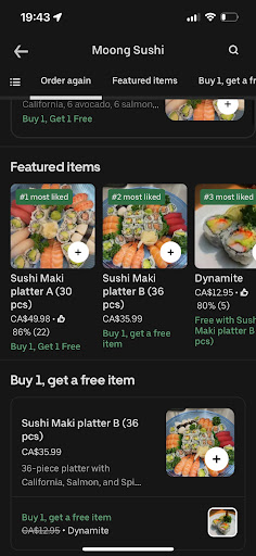 Read moreI ordered the Sushi Maki Platter B (36 pcs) because it was listed as a “Buy 1, Get 1 Free” deal. However, my first order was canceled without explanation, and when I reordered, I only received one platter instead of two.