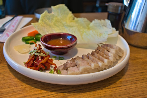 And then she asked us to sit at a specific table but the moment we told her we wanted to get take out she told us we need to get up and just stand ( once again with very rude behavior) and immediately gave our table to another customer even though there were still other tables available. Throughout the time we were standing waiting for the bossam, she passed us so many times but she never asked us to sit or offer us water or anything. She acted like we were just invisible which is very disappointing because WE ARE STILL PAYING CUSTOMERS even when we got it for take out. Unbelievable. The other staff also didn't do anything and just passed by us. The other staff ( with no bangs and also ponytail) came to us with our order with no smile, and rudely said " medium bossam" while handing it to us WITHOUT MAKING EYE CONTACT. It's very unprofessional and unnecessary rudeness as we all are fellow human beings and being treated like this when we clearly are ABLE TO PAY.