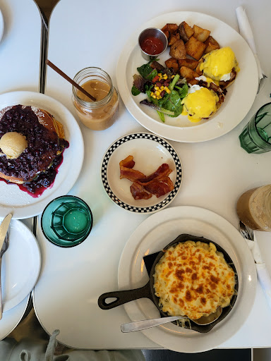 Read moreWe were a group of 3 dined around 3pm on a Sunday. It was busy and there were a lot of servers, ours was very good. We booked a reservation for indoor dining but to my surprise, the whole restaurant had open windows, it was hot which I didn't expect - this should be indicated upon booking. It doesn't make sense to choose between indoor or outdoor when indoor feels like outdoor. It was uncomfortable to eat on hot summer days in this kind of set up - I hate to say this but it's gross. Sunday was so busy too, and I could not believe that this place is cheap on electricity, sales must be big. There was only 2 cubicles to use the bathroom, male and female, there was a line to use the ladies and it was hot uncomfortably hot so I didn't bother. Food tasted cheap and is overpriced. I ordered mac n cheese and there was nothing special that I could make a better one at home. Macaroni used is cheap, I know this because it's hard to over cook italian pasta, theirs is some nasty wholesale macaroni. The iced mocha was ok, could barely taste the chocolate and it tasted like iced coffee which my friend ordered, except that iced mocha had whipped cream. The popular blueberry pancake was homemade and had an after taste from the baking soda / baking powder - they did not perfect the batter. It came with bacon which was ok. This place is over rated , over hyped and over priced. Will not come back again and will never bring anyone I know there. We split the blueberry pancake to 3, nasty mac n cheese for 16.95, iced mocha for 6 dollars - my tab was 33.45 it was...