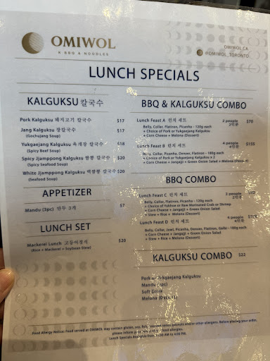 Read moreJeju Island BBQ comes to Toronto!! OK, I must be dreaming of Jeju again but this is the best K BBQ experience Iâve had since we went to Sukseongdo in Jeju (ěěąëë ¸í본ę´) and Bekmiwoo in Seoul. I will have to return at least 4 times to try their entire menu - and thatâs only if they donât add some other new and delicious things. My foodie son all the way down in Florida read about Omiwol on blogTO and paid for my birthday meal. My 94 yo mom and I enjoyed the Lunch Feast C for $90. Everything was so delicious! I was a bit confused by the different 2-person sets so I asked the friendly waiter. Lunch Feast A is $70 and comes with a choice of noodles. Lunch Feast C is $90 and includes a choice of raw appetizers (beef tartare, crab or shrimp) + a stew (jigae) and rice. Both lunch sets offer the same amount of meat and Melona popsicles. The Mini Omiwol set is $110 for 2 people and comes with kimchi fried rice. Today we opted for the Lunch Feast C because we wanted to try their soy sauce marinated raw crab. It was a fresh and tasty âflowerâ type crab which I believe is the type used in Korea. Most GTA restaurants only use blue crab. Too bad Omiwolâs didnât have any precious roe or tomalley. Was it because they were not female crabs? I donât know but I like the roe. Probably female crabs are more expensive. The veggie side dishes were all delicious. I havenât had the pickled perilla leaf since my friendâs mother visited from Korea and she shared with me. It made me think fondly of her. The stew was very delicious. Served bubbling in a Ttukbaegi, it was a thick red soup chock full of tender pork, kabocha squash, tofu and zucchini. The squash naturally lent its sweetness and thickness to the stew. Although it was bright red, it wasnât too spicy and Mom could enjoy it too. I would happily drink it every day. The waiter said the ingredients might change depending on the season. In any case, Iâm sure Omiwol follows a nose-to-tail approach to meat use and will take advantage of their abundance to create a rich, meaty stock for any of their stews. And what should I say about the meat? The sets currently do NOT include the Heritage cuts so I will return next time and order Ă la carte. I told the waiter that we enjoyed the aged black pig in Jeju and he suggested that next time, we try their Ontario-raised Heritage pork - a breed similar to the Jeju black pork. Our Lunch Feast C offered a pork belly and collar plus a beef picanha and flatiron. They were very rich and delicious. I wanted to taste the meat only so I ate mine NOT as a ssam. Later, I made myself some ssams with the lettuce, yummy kimchi and jangajji (pickled, non-fermented veg). Portions are generous so we asked for take out containers. Iâm looking forward to eating those. Dessert was a choice of 5 Melona bars. Iâm normally not a supermarket dessert person so I have never tasted Melona before. After today, Itâs my new obsession! The melon flavoured popsicle tastes exactly like honeydew melon and cream. It was the perfect ending to a...