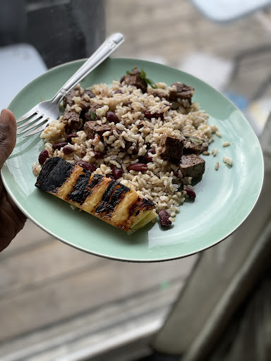 Moroccan Beefless One of my childhood friends is Moroccan, which is to say that I grew up eating my share of Moroccan cuisine. The first thing I said when I took a bite of this meal was, “Oh, this tastes just like insert-friend’s-mom’s-name used to make!” It’s authentic. The hummus that accompanies this dish is zesty, creamy, and flavourful, and it nicely balances the spices used in this dish that are found in traditional Moroccan cuisine. Aside from the flavours, what stood out to me were the textures of this meal: the smooth creaminess of the hummus, the crunch of the grilled veggies, and the fluffiness rice and lentils, that’s all grounded by the beefless beef.