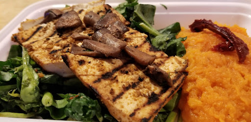 Tuscan Tofu I’m a big fan of a sweet potato and greens dish with some sort of protein. So, of my order, I was the most excited to try this one. It did not disappoint—far from it! It delivered above and beyond my expectations. Looking at it, I kept forgetting that the broiled tofu wasn’t a piece of a grilled chicken breast. But thankfully, it is totally meat free. With its charbroiled marks, you can taste the fiery grill on the tofu which really brings out the taste of the traditional Tuscan spices. Accompanying the tofu is a bed of crisp, leafy greens and (I’m salivating just thinking about it), the most velvety sweet potato mash...