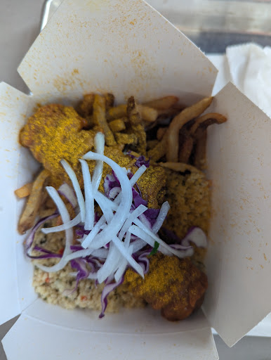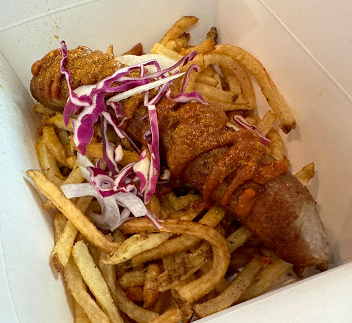 I got the seasonal currywurst with a 50/50 mix of fries and couscous. The couscous was very goo, which surprised me. The fries was ok...wish they were a little more crunchy. The currywurst was good not amazing but good. I'd eat this again for sure. It's not the cheapest lunch option in the area but it feels healthy.