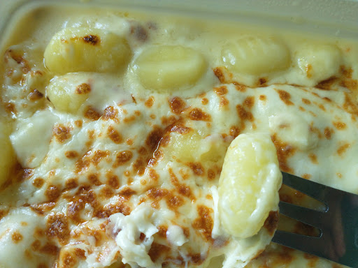 In the picture: Note the uniformity of each "gnocchi" which would not occur in properly-made, real gnocchi. Also, if you zoom in, you can see the yellowish, almost translucent colour (they should be solid white due to flour...