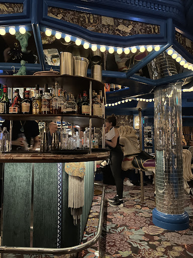 The fixtures are on point from the merry-go-round central bar (complete with photo-op horse), to comfortable chairs at quaint two- and four-tops, circular booths for groups, mirrored columns, and gallery walls. Every surface has its own print - Medieval print wallpaper, animal print stools, and ornate carpets.