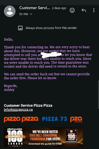 When I reached out to Pizza Pizza directly through their "feedback" email (which was copied and pasted by the owner on Google Maps), I received this dismissive and unhelpful response: