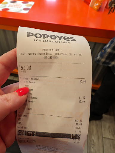 Read moreI made a complaint about the six-piece chicken I purchased from Popeyes (Birchmount and Sheppard branch) because it was difficult to eat and appeared to be very stale chicken. An hour later, I received a call from the branch asking me to place another order, so I said I would pick it up the following week. When I called them a week later, manager Ashwini answered the phone and told me to come grab the chicken. Later, when I went to the store to buy the chicken, Mrs. Zeya was there and she was glad to see me and welcome me, but when I told her I was there to buy the chicken for free which was told by the manager, her expression changed and she didn't want to give it to me.Later, Aditya, one of the worst managers I've ever encountered, spoke to me. She was incredibly rude and did not pay attention to what I had to say because Zeya and Aditya were conversing behind my back. As a result, Aditya was really terrible at dealing with customers. After a week, she asked for my one-week-old chicken piece. I would not recommend this shop to anyone because Zeya and Aditya are...