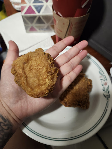 Read moreThis is what you get for over $5 for 2 pieces?? It's literally smaller than my palm... I waited over 40 minutes for you guys to make a new batch when you said 15 minutes for the rush, on top of that I watched your cashier handle money, digging through all the change to look for the right change for the customer and then turned around and took the tissue paper and stuff the tissue paper with her full fist in the box and then preceded to put the chicken on the tissue paper, without washing her hands first. Does she even wash her hands at all? I see why people were lining up for KFC, at least for the price, it makes sense. Also, there's a Popeyes on Dufferin and East on Bloor, you can't miss it. They have better customer service and the pieces are literally triple this pigeon leg size. I eat 2 pieces and I'm full (dufferin and bloor), but here I eat 4 pieces and I'm not even close to full. Trust me, the little walk from dufferin mall...