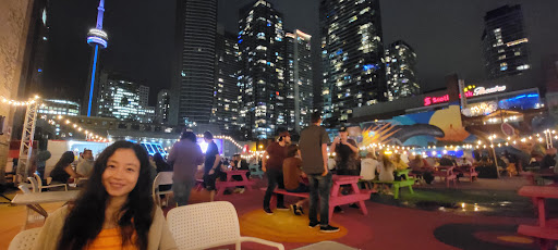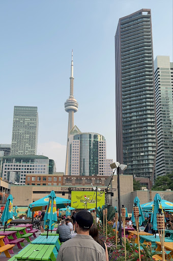 Read moreThis is a special place that just opened up their huge colorful patio and is seeing a lot of footfalls lately. It has a very friendly greeting at the reception and usually the waiting line moves fast, if you go there without a reservation. It is a BIG place, would rather call it a 'food park' with a bar, rather than a patio. There is music, a huge screen showing mostly sports or some visual effects, lots of benches and the vibes are young and cheerful. The service is good and so is the ambiance (you can see CN tower from there and the place has mastered in visual artwork and placement of lights), but this comes with a high cost. The food menu is limited, and my experience with the food was lukewarm. I ordered Chicken bites which were a bit lackluster but I'm sure some other items on the menu may taste better.