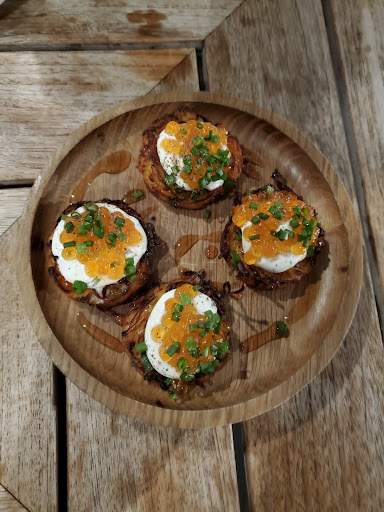 Food We had the squash latkes (our favourite dish of the night), duck wontons (I'm Asian so I found these expensive for 2 small wontons, for the price you should get at least 4, and the taste was just was ok... I can make better homemade dumplings myself, so these were our least favourite), tocino octopus and pork belly (really good tender octopus and pork belly, reminded me of Filipino sweet breakfast sausage, if you're Filipino you know the taste I'm talking about), buttermilk fried chicken (this was okay and good size portion), and the wagyu reuben (very good but again small portion).