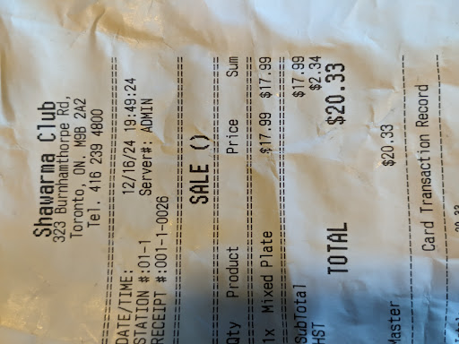 So the first time I visited Shawarma Club it was closed for renovations. I honestly forgot about it until it popped up on food near me on Google. So I was eager to taste some new Shawarma in the neighborhood. I ordered the mixed dinner meal as you can see from my bill, and also got charged HST. The person working had no clue what was going on. It was my understanding that all prepared foods from any restaurant fell under the government's tax rebate?!? I have no problem paying the price with taxes, like everyone else I just wanted a break since 90% of my food is takeout. Well I respect the fact they will give you a meal if you can't afford to pay. Now for the food. I will say that for the original cost of the meal and the amount of food you do get is worth the price. I got a lot of beef and chicken, less rice and salad. For the amount of meat I definitely needed more sauces. I'd even pay for that if I had to. And maybe a pita. Separate the salad for takeout so it doesn't get so soggy. I will visit again and just get the mixed on rice another day to see what happens. Hope this helps the restaurant and customers. Have a good day...