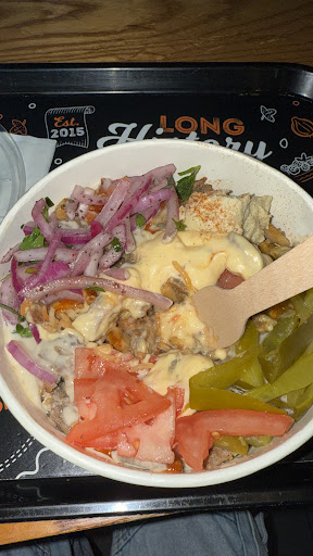 I ordered the shawarma bowl, and from the very first bite, I was shocked. The flavors hit differently—in the best way possible. The chicken was juicy, tender, and perfectly seasoned with rich spices that soaked right into the rice. The bowl was loaded with delicious toppings: fresh tomato slices, sharp red onions mixed with parsley and lemon, crunchy pickled peppers, and a creamy scoop of hummus dusted with paprika.