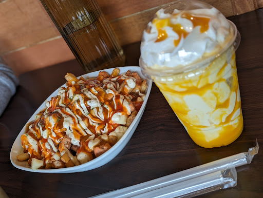 We ordered chicken shawarma poutine, mango milkshake and mighty chicken zinger burger.
