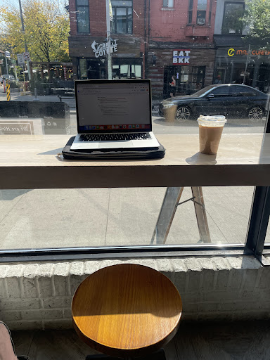 A decent spot, not too exceptional or cool in any way. A typical Toronto coffee shop in the sense that they had very uncomfortable seats (see the pictures). Their tables were small so you can’t have too many things out at once, if you’re a multitasker who reads 2 books while making notes and also has a laptop out. Most of their chairs had no cushions with the exception of 3-4 sofas in the Center of the shop and so their chairs weren’t the most comfortable to sit on for prolonged periods of time which is an indicator they don’t really want you to stay there for too long. The staff also seemed quite rude and upset at me when I was taking a while to choose, even though I wasn’t holding anyone up (because there was no line and no one behind me) so that wasn’t very welcoming. However, the prices are average which makes it a fine place overall. I paid $5.99 in total after tax for my latte with no additions or modifications and as you can see in the picture, it was a good...