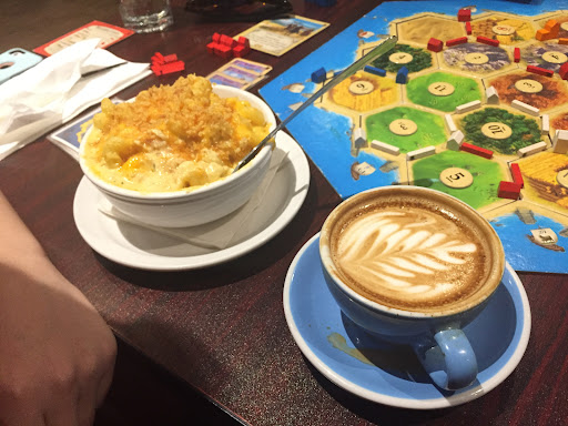Read moreGenerally the food is pretty good, something are better than others but the price is what gets me, you're here to play board games so you sorta have to be here for a number of hours and you're GOING to get hungry but if you want anything substantial you're going to have to pay 15-25$ on TOP of the required game fee of 8$, and don't think you can just get a drink and be fine since most drinks range from 10-15$, they frequently don't have drip coffee so don't think you can just get that either. The staff themselves are friendly and nice but are clearly understaffed and overwhelmed most of the time that if you want to get the bill or order something else you're going to have to be fast to wave someone down or else you won't see anyone for another 15-20 minutes. If you come with a group of 6 or more you're also charged a required tip on top of everything else. I personally got the soup of the day which was the cheapest food option and caved since I was so hungry and shared the pretzel bites with 2 other people and my personal bill came out to 25$ and I left hungry. The others had bills ranging from 40-90$ so definitely come full. They also messed up our orders twice, giving us a latte instead of a hot chocolate to my friend who has a sensitivity to caffeine, and then came with an oreo cheesecake instead of caramel which was an easier fix thankfully. All in all it was a pleasant-enough experience but did not leave me wanting...