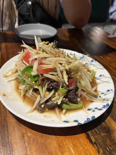 Read moreIf you're staying at the Chelsea Hotel in Toronto, I highly recommend visiting Som Tum Jinda. It's just 0.3 miles away from the hotel, which is about a 10-minute walk. Originally, we planned to dine at a different thai restaurant but our plans changed, so we opted out. While scrolling through Google Maps, I stumbled upon this new spot. Since it was walkable distance to our hotel, we decided to give it a try. As a somtum (papaya salad) enthusiast, I was thrilled to discover that the restaurant was named after it. To me, this signaled that the owners were very confident in their dish. As soon as l walked into the restaurant, I was seated immediately and greeted with big smiles. I really liked the interiors, especially the lighting and the paintings. My boyfriend and I ordered papaya salad with salted crab, grilled pork jowl, and pad see eew. Everything tasted phenomenal, and I don't think I'll ever forget my very first bite. It was my first time trying papaya salad with salted crab, and it reminded me of a sweeter version of ganjang gaejang (Korean raw soy sauce crabs). Also, it was my very first time trying the grilled pork jowl. As soon as you put it in your mouth it will melt in your mouth. I don't even think words can do justice to how amazing this dish was--it's just outstanding, and I wish everyone could try it. The servers were very attentive and always kept big smiles on their faces. My only regret is not being able to try more items from the menu, as my time in Toronto was limited and I had other places to visit. I will definitely be back and can't wait to try...