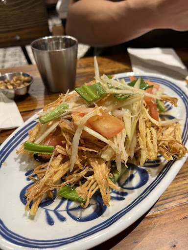 The Som Tum Tod has three thumbs, which indicates a must-order. It's fried papaya salad topped with peanut, garlic, chili, tomato, dried shrimp, green bean. It was my first time trying out fried papaya salad and it definitely won't be my last!