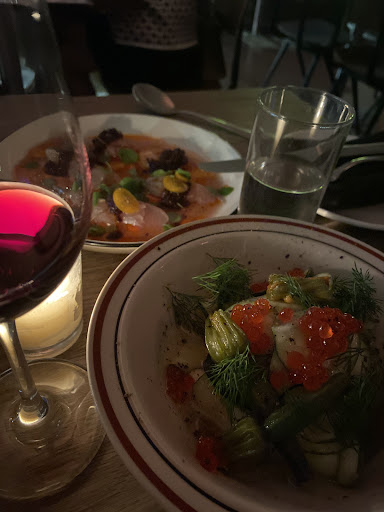 Read moreI like this spot and I think the vibe is great. Most of the food was wonderful but I have to say, the Octopus was incredibly tough and chewy. Like, sort of the way you're not supposed to cook octopus. It used to be that no one did octopus except authentic Mediterranean or very very fine dining restaurants but then Bar Isabel went and made it a Toronto googoo gaga dish and now it's everywhere but maybe it shouldn't be? Maybe, we should treat it like the delicacy it is and stop putting it on every menu unless we're willing to take the time to cook it so it's not tough. There was a reason not everyone did it, it takes time to marinate and slow cook or sous-vide very very carefully and then grill to order so that it's charred yet tender. This Octopus was incredibly tough, crunchy even. This is not the first un-tender octopus I've had lately so I feel like it needs to be mentioned here because it's kind of tarnishing the dish's reputation at this point. I ordered it because my date had never tried Octopus and assumed this would be a worthy introduction, it was not. Everything else was really nice, the beef cheek was perfectly braised, I liked the way they dressed the oysters, beef tartare (another Toronto gaga dish) was very nice. Decent wine selection as well. Would come back but $36 for tough octopus gives me...