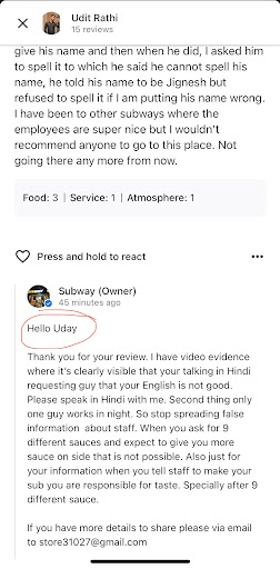Reply to the Store Review: I think you posted a wrong reply under my post because first of all that’s clearly not my name which you have used in the reply to my review. Secondly, I went to the store on September 02, 2024 at around 12:15AM and during this time there were two person on the Cashier side of the store. And if this reply from the store is really about me then I do need to see that video where I am asking the employee to speak the other language you mentioned because fun fact is I know the name of that language you mentioned but I don’t know how to speak that at all. And finally, since you mentioned that I asked for 9 plus sauces, I hope this was recorded that your employee served me with atleast 4 of them since I demanded 9. Please let me know if I have to email you on the mentioned email to see the video of my visit along with the audio as you claim because now I am the one being defamed here which is not acceptable to me at all.