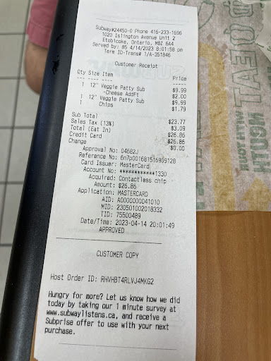So I walk out with a $14 regular price for a basic foot-long sub? I might as well go to a proper Shawarma place with much tastier food and help local owners instead of corporation. What disappointing customer service experience. Don't go to Subway unless you are starving and no...