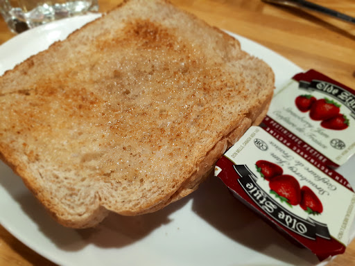 Now, a few more comments about the food that we had. Overall, taste is what you'd expect - a good hearty breakfast. If you ask for over easy eggs, they will come to you over easy. Scrambled is scrambled. The breakfast sausages taste good - what you'd expect. Perhaps the only thing to mention is that the bacon is on the saltier side but definitely crispy. Bread - you get your choice of white, brown, or rye. Featured in the images is the brown bread.