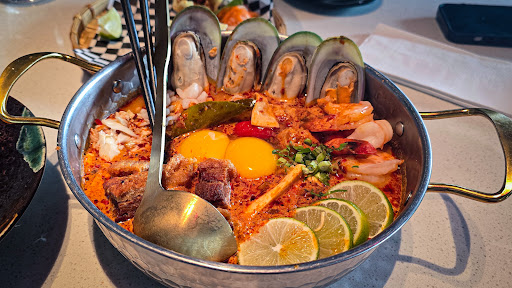 Mama Tom Yum (Mild) A luxurious take on the classic Thai âmama noodles,â loaded with shrimp, squid, crab, mussels, and crispy pork. The raw egg yolk on top melts into the broth, giving it a silky, savory texture. The soup is bright and tangy with lemongrass, galangal, and lime leaf aroma â mild in heat but bursting with flavor. Comforting and addictive till the last spoon.