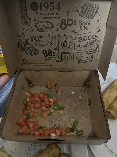 I will say the deal we got was definitely worth the price on my app, but for some reason, on my fiancĂ©s app, the prices were a couple dollars higher for the exact same options, and yes, we checked to make sure it was the same location. We ordered 2 can dine premium meals, through my app, a garlic loaf, and spring rolls. I donât understand however, the thought process that went into packaging the garlic loaf. I understand for a dine in order, putting the bruschetta topping is fine, as it will be eaten promptly, but when youâre a take out order, youâd think itâd be best to maybe put those toppings inside a container of some sort, so it doesnât completely ruin the bread loaf. The garlic loaf was soggy on the bottom due to the loaf being placed on top of the bruschetta (pictured), without any type of divider. Just, splash the bruschetta in the box, throw the bread and let it sop it up while it sits and waits to be picked up. I know there is some common sense at play here in their kitchen, because my Caesar salad came fully de-constructed, so the croutons donât get soggy with the salad dressing, etc. I wish the same thought went into the garlic loaf. My fiancĂ© was most excited for that, and it was ruined. Otherwise, the chicken was super tasty, the dinner rolls were nice and soft, and canât complain about that wonderful chalet sauce. Iâll definitely return again, I just hope that someone cares enough to implement this for future garlic loaf orders, as Iâll most certainly be ordering...