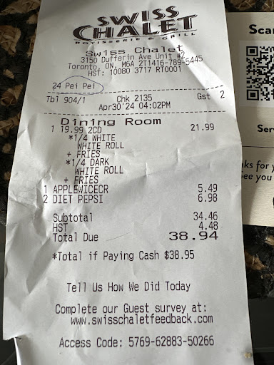 Read moreTo try out the roast beef dinner special, I drove away from my usual Swiss Chalet location to go to this one on Dufferin instead. A different franchise owner. Along with family members, I'd been there before and everything always went well. Just as it did today with a few glitches.