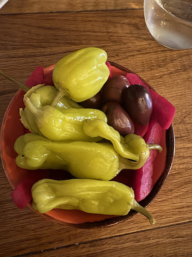We were quickly greeted and welcomed to our table. The room is nicely done and doesn't scream the traditional kitchsy design of palm trees, tajines, or peaked arches. It's a lovely space with dark walnuts, clean modern lighting, and pops of colour. Our tables were close to the other ones but I can see how popular this place was that they need to pack it in.