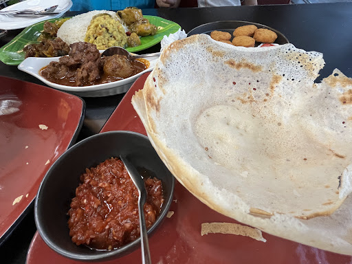 Server was nice/polite but food quality was not the greatest. The rice and chicken/veggie curry dish had cold rice but she said they had heated it up and was โbecause of the weatherโ. She took the dish back to reheat after we asked her but the rice was still not hot, just slightly warm. We had to ask her for plates and for two adults and one child, we got 1 jug of water, 1 water glass, 1 fork, 1 spoon and 2 butter knives for the rice with chicken and veggie curries, chicken nuggets and egg / plain hoppers. Hoppers were good with the very spicy chili sambal. Chicken nuggets were crispy. Curries were spicy.