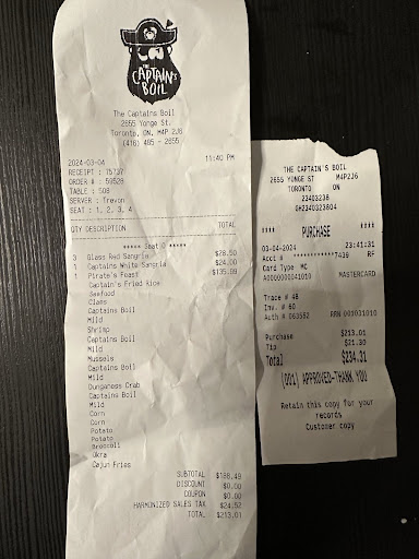 Read moreI donât normally do this but I believe I need to let everyone know about my experience. This location closes at 12 A.M on Fridays. We were in the area and felt hungry and decided to stop by. Before going to the restaurant I called to find out what time is the dine in cut off time, I was told 11 pm. We arrived at the restaurant at 10:40 pm and we were greeted by Tony (Asian) whoâs first words to me were âdid you book a reservationâ I said no, but I called before coming here and they told me the dining cut off time was 11pm, he had a certain demeanour as if we did not belong there. He then pointed to a table basically letting me know I could sit there. He then walked to the counter and I could hear him mumbling to the other server about us. I could tell that he was upset that I showed up at the restaurant to dine in at 10:40 pm. The other server came over and took the order, he was polite, kind and continuously checked on us. TONY checked on every other client in the restaurant except us. He asked everyone else if they were fine and if they needed anything and he totally ignored the members at our table. Captains boil is our regular Friday night spot but this was our first time trying this location and the experience was horrible! Only because Tony was rude and felt the need to let paying customers feel like we had no business in the restaurant.