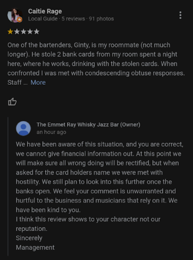 Now for the claims of hostility, I would like to cordially invite you to involve the police in the matter, there was no hostility whatsoever. By all means, please call them and have them come in. I'd love to see how this all pans out. As for the case of fraud, a full investigation has already been opened. You will be hearing from a legal team shortly. It is a true shame to see an atmosphere and reputation tarnished by one dishonest employee. At the end of the day, you are liable. Not only are you protecting an alcoholic, abusive, thief "employee". But to turn around and make false claims of hostility just to try and flip the script and salvage whatever reputation you can, while also blatantly lying to your "valued" customers about how you do business speaks volumes about YOUR true character. My legal team, bank, and police alike will be in touch with you. For the record myself being the card holder. I was not once asked for my name at The Emmet Ray so that is also another false claim.