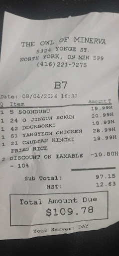 Read moreUpon my recent visit to a Korean restaurant(The famous owl of minerva in North york), I had the pleasure of indulging in some truly delectable food. From the moment I stepped inside, the warm and inviting ambiance made me feel right at home. The friendly staff swiftly seated me and assisted in making recommendations from the diverse menu. One dish that particularly stood out to me was the traditional bulgogi. The tender marinated beef, grilled to perfection, offered a harmonious balance of sweet and savory flavors. Every succulent bite left me craving for more. Accompanied by a side of steamed rice and an assortment of banchan, the combination was absolutely delightful. The banchan, with its vibrant and diverse flavors, complemented the main dish wonderfully. The service at the restaurant was exceptional as well. Despite the busy atmosphere, the staff remained attentive and efficient in their service. They were more than happy to offer recommendations and answer any questions I had, making my dining experience even more enjoyable. Visit to this Korean restaurant was a true feast for the senses. From the moment I stepped through the doors, I was greeted by friendly faces and treated to an array of mouthwatering dishes. The flavors and authenticity of the food were unparalleled, and the attentive service only added to my overall satisfaction. I would highly recommend this restaurant to anyone seeking an authentic and memorable Korean...