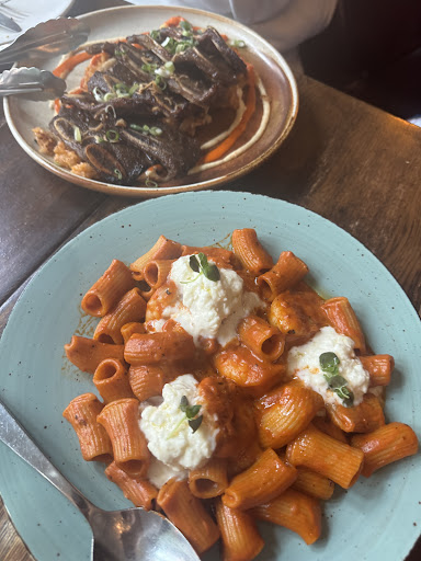Read moreOkay where do I start? My friend and I went during brunch. I was not expecting what I experienced when I walked up to this place. A friend and I picked it randomly just as a change from out notmal routine. When I first walked in it looked like a quaint little retro bakery or shop. Boy oh boy do they get you lol. When you enter the dinning area its so rustic and beautiful. It gives old gentlemen cigar club vibes. Armchairs and leather banquets for seating is so cozy its unreal. The service is amazing our server was able to suggest things to us geared to what we were telling her not just rattling off specials like other places. Another thing I appreciated was that she asked about allergies. Asked...without being prompted...I was so happy as I have a severe Shellfish allergy that I forget to mention sometimes (a lot of the time). The manager David was so warm and inviting not to mention attentive. He was making small talk with the patrons and just added to the already delightful atmosphere. As for the food, the menu is a nice fusion of italian, Thai, and Mexican. It sounds like a lot but is done so well it just makes sense. The seasonings were on point. Key thing fire burning oven!! It makes all the difference. There are non dairy options for coffee which was much appreciated. You're not rushed to eat so that they can turn over the table, its all very natual. Feels like your at a friends dining room table. All around 10/10 definitely recommend!