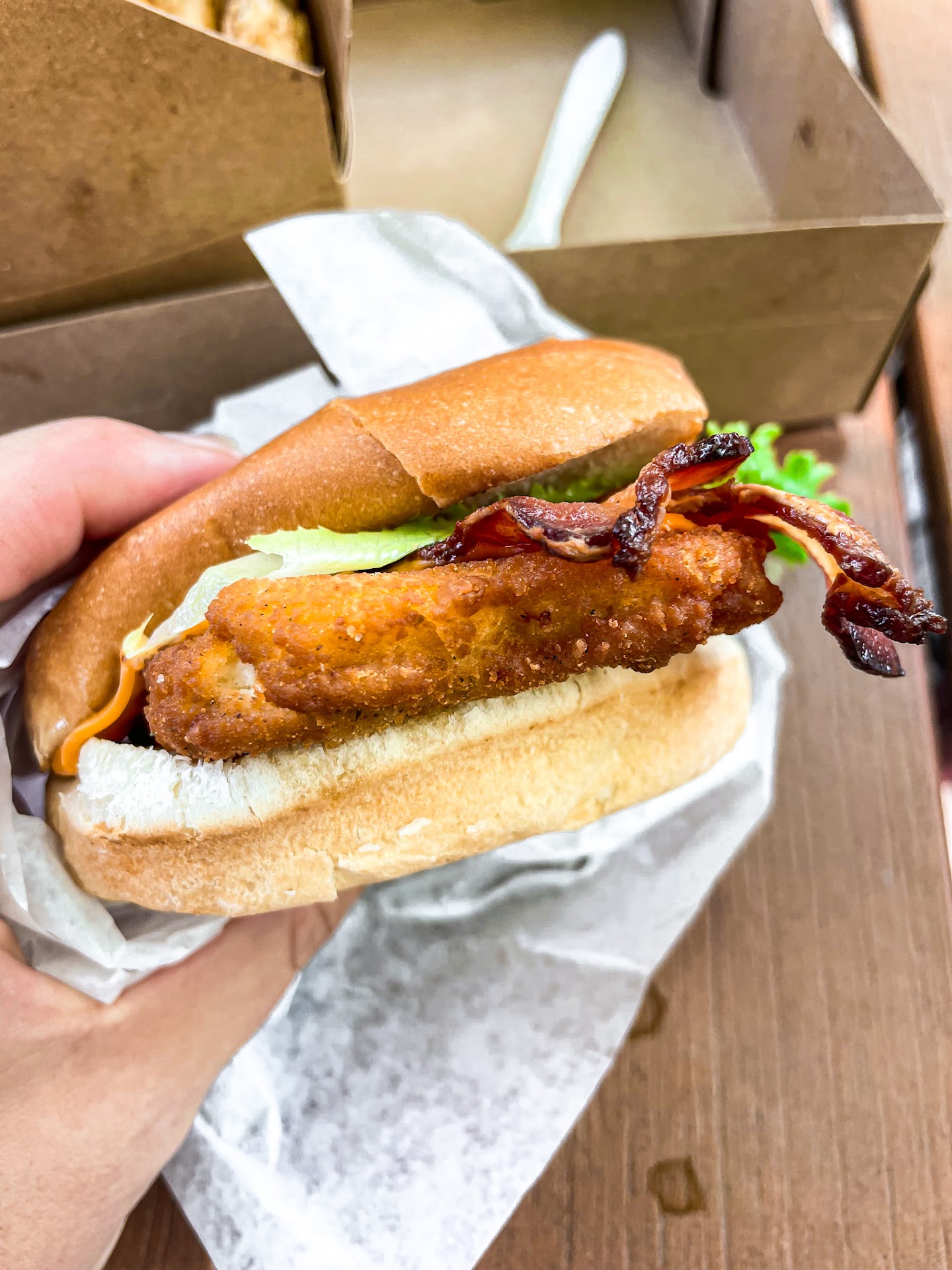 The chicken burger ($8.99) is okay. It’s definitely an industrial patty, but with a nice crispy outer coating. It costs extra to get cheese ($1.75) and bacon ($2), but the burger would be too bland without them.