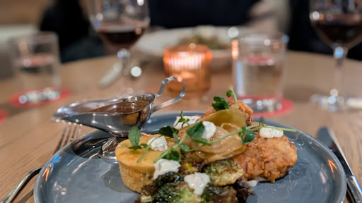 As for our mains, this is where things turned south. My partner opted for the Beef Stroganoff Penne, described as slow-roasted beef, cream, green peppercorns, caramelized onions, button mushrooms. It was not particularly flavouful but more importantly, the ābeef...???ā selected for this dish was tough and full of grissel ā the majority of it inedible. And not that flavourful. I chose the Buttermilk Fried Chicken, consisting of chicken, cornbread, crispy brussels sprouts, spicy maple syrup, pickled green tomatoes. The dish tasted quite good, but my complaint is that it arrived not particularly hot and on a cold plate, so it got to room temp before I was even part way done. I did mention to the friendly busser when he asked how was the meal, that the kitchen should be serving the dish on a warm/hot plate, as was the Beef Penne my partner had. A small detail that would add a lot to the experience.