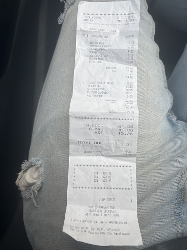 Read moreThe service was slow, non comprehensive and disappointing. Our server Laura, seemed as if she was disoriented. I asked for the Moscow mule and my boyfriend ask for a krackin and coke. She brought him a jack daniels & coke instead. My boyfriend then corrected her. She apologized then proceeded to get the correct drink. After about 45 minutes our appetizers came to the table. 10 minutes after our apps hit the table, she then proceeded to inform us, they were closing the patio. By then she asked if we would like another drink. Yes, I asked for another and my boyfriend declined. We then went ahead & ordered our mains right away. 10 mins later she still brought him a drink to the table when she brought my second drink. When he had expressed to her that he did not ask for the drink. She then, ignored and proceeded to serve the other guests. 15-20 mins after placing our mains. Everything came out and the waiters offered us to which tables due to the amount of food we had order. (No space on the table) The food was tasting alright but the wings were tasting under cooked. We then flagged laura down to ask for take out containers and our bill. Where I then emphasized that the drink was untouched and was not asked for. Laura took the drink & at that point she came back to the table to give us the containers. She asked if we were paying by machine or cash to my boyfriend. He said machine. Laura then walked away and sat down to continue rolling cutlery. Where again, I had to flag her down to ask for the machine. I proceeded to pay and did not leave a tip. Due to the service not being amazing. Laura then came back to the table to take up the plates, but slamming the plates angrily together in the process of doing so. I looked back surprisingly startled by the plates. She proceeded swearing from underneath her breath, loud enough for us to acknowledge what she was saying as we were heading down to leave the restaurant. Would I go back to wear house? Probably not, because this has been the type of service the we get presented with every time. Even after we had decided not to come in almost two years because of the same reasons. Truly a...
