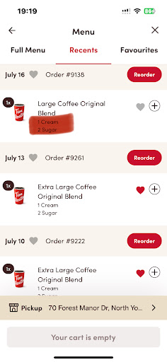 Ā Ā Ā Read moreOnce again, they mess up my coffee!! All these days I had been avoiding a negative post, but finally my patience runs out after they add more cream than asked for, most of the servers are just rushing to close orders (irony-they are still late on almost all my orders). Tims remains the best but service at this franchise is awful (being very gentle).