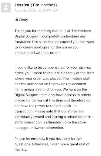 Read moreThe majority of the staff here are lovely and they prepare your food and drink so quickly, but there is one employee there who is persistently miserable. Like, to the point that she makes visiting this location unpleasant. Her angrily slamming my straw and receipt on the counter was the last straw (pun not intended) and I'll be taking my coffee-related needs to the nearby Starbucks. Now, if she were this rude but also efficient, maybe it wouldn't be so bad, but she's constantly relying on other employees to find the items for her in the POS system, so she doesn't even have that going for her. Like I said, the rest of the staff are lovely, but her poor customer service really detracts from all the positives of this location. I think she needs supplementary training, and I say this as a former Tim's employee and someone who worked foodservice all through uni. EDIT: After reading other reviews, I see I'm not the only one who's complained about this employee. She's an elderly Filipino lady wearing glasses and she usually works the morning shift. I get it that everybody has off days, but going off of reviews and my own experiences at this location, it seems that she has them more often than not. The story shared by another reviewer also indicates that the level of service provided by this employee is determined by a customer's gender. Yikes! I reached out to the Tim Hortons guest services team before I wrote this review and I appreciate the owner's response to this review. Hopefully this behaviour is addressed with this employee so that every customer can have a pleasant experience at...