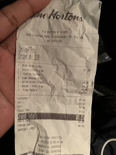 Read moreRyan (the branch manager) needs to actually train the employees at this location with the acception of Hashini (who should be the manager) nobody at this location knows how to do their job, I come to this location multiple times a day and spend a lot of money there (easily 40 dollars a day) as I've lived beside the location for 6 years. I'm utterly disgusted at the fact I cannot order a dark roast double double without it either being burnt, old or tasting like chemicals which I believe is them cleaning the pots with descaler and not thoroughly rinsing them. I've had more coffees dumped down the sink then I have enjoyed, even tried getting steep tea at times, hoping they don't mess that up too which they still manage to do. I would really appreciate whoever is in charge of this location to somehow correct their untrained staff it's utterly pathetic how I cannot trust a chain like Tim hortons to have a quality control over their products. I can go to Starbucks right now and order a drink I haven't had in years and it'll taste just as I remembered it years prior. I'm writing this as I'm stuck forcing down a burnt dark roast double double and a begal that was suppose to be toasted but was not and a cold hashbrown. RYAN DO SOMETHING ABOUT THIS, IM ALSO GOING TO WRITE AN EMAIL TO...