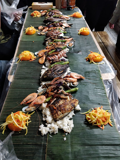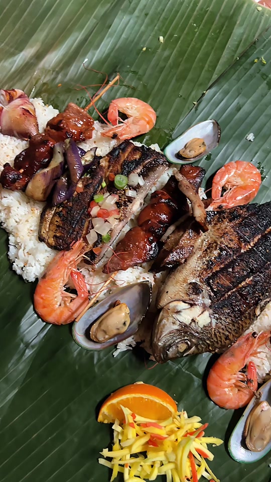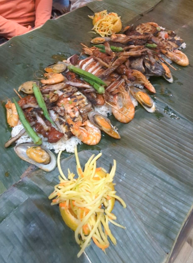 The food consists of unlimited garlic rice, seafood (grilled shrimp/squid/milkfish/tilapia, steamed mussels) meat (pork belly and bbq pork skewer), veggies (boiled okra/eggplant), mango salad and orange slices for dessert.