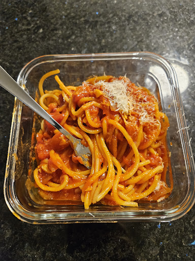 The spaghetti came in bags indicating it should be boiled from frozen. Although I sometimes freeze fresh pasta, I don't want to receive it frozen, so I immediately raised my eyebrow at that. However, it had a pleasant snap when cooked al dente, so the texture was perfect. It released a ton of gluten when I was boiling it: the water in the pot was really murky when I poured it through a strainer (after reserving some for the sauce — this isn't my first time cooking pasta!). I'm not sure what that means, but this isn't a pasta I would boil in its sauce (not that I do that anyway, but that's a whole other story). I made a pretty simple tomato sauce as an accompaniment, and it turned out great.